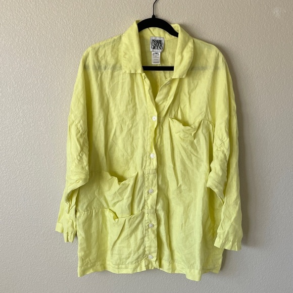 Tags: bohemian, boho, lagenlook, linen, oversized, artsy, butter yellow, USA made, prairie underground, top, button down, shirt, women’s, art to wear