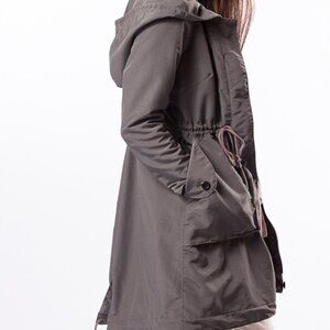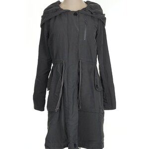 Moody and gorgeous Lost Highway coat from 2013. Nylon outer, super soft organic cotton and recycled polyester inner along the body. Tuxedo tail, hand pockets and chest zipper pocket. Front zip with waist and tail drawstrings. Large cloak style hood. Made in the USA.