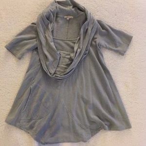 Prairie Underground Your Orbit Tunic in grey. Cozy, oversized cowl neck and big, functional pockets, plus a cool asymmetrical hem and stitching that keeps you feeling both on point and at ease all day. Fit is loose and swingy in the body and nicely shaped across shoulders and upper back.