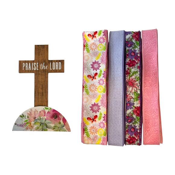 Praise the Lord Cross Floral Sign & Ribbon Bundle Set, DIY Spring Wreath Kit