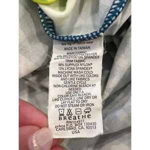 Super cute and comfortable Prana sundress with a strappy cross back detail. Pullover style. Built-in-bra. Teal / blue / green allover pattern on a white background. Unlined. Fabric is 45% recycled polyester / 45% polyester / 10% spandex