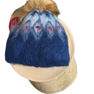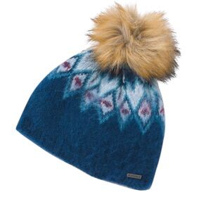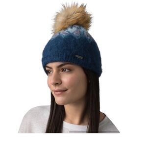 Stylish Prana knit hat. Features blue and white pattern. Topped with faux fur pom.
