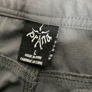 - Features open hand pockets with an adjustable waist for a great fit, side zip pocket and back pockets. Chino inspired style. Material tag is missing but is a cotton blend with no stretch. Color gray.