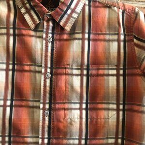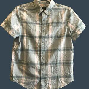 Set of 2 Prana plaid button down short sleeve shirts, size small. These casual street wear shirts feature pockets, perfect for everyday wear.