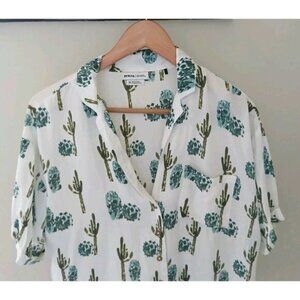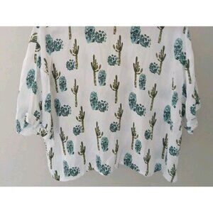 Prana Button Front Iguala Top. Size Medium. White with a cactus peint. No care tag, but online states a tencel modal blend. Cropped. Breathable. Short sleeves, Travel, Active. In nice, preowned condition. No flaws noted. Measures approximately 21" pit to pit, 19" shoulder to hem.