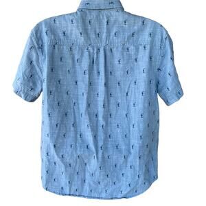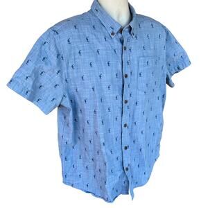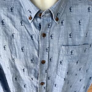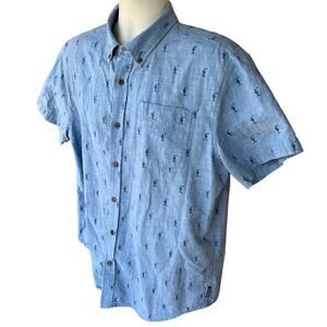 Prana Button Front Short Sleeve Denim Chambray Cacti Print Collared Shirt Mens L