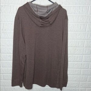 Prana hooded top in chocolate brown. Soft fabric with long sleeves.