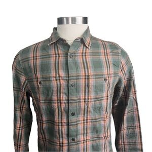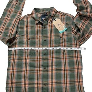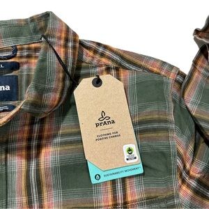Prana Dolberg Flannel Shirt Tall Men’s Multicolor Green Orange Black Red Plaid Check 2 Pentagon Shaped Pockets with Buttons 100% Organic Cotton Embroidered “Prana” Spell Out on Cuff Long Sleeve Button-Front Size Small Tall. This shirt is new with tags.