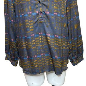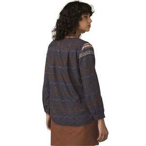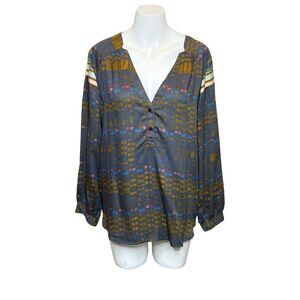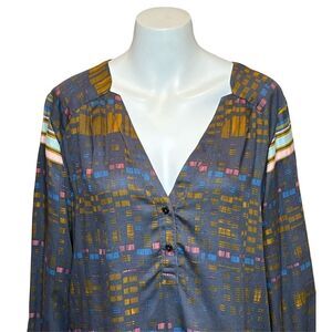 Prana Elsie long sleeve multicolored print popover top size L. Style W23202197. V neck 1/2 button front. Button wrists. Relaxed fit. Colors blue, gray and gold. Good condition. Size tag removed but is woven 100% tencel lyocell. Length 25” Chest 22”.