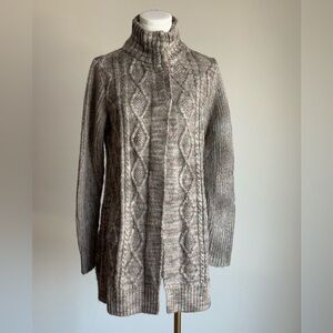 Can be worn open or snapped at the neck with a slowly open feel at the bottom. Earth tone colours of brown, beige. Long sleeves, turtleneck when snapped closed. Great pre owned condition.