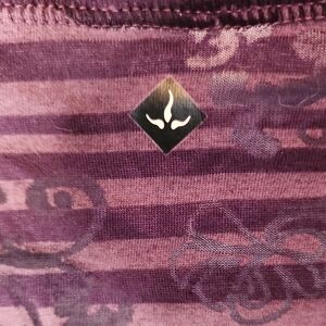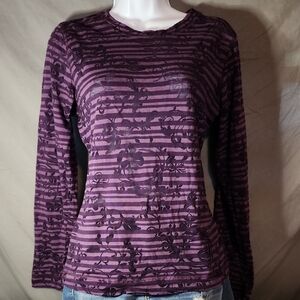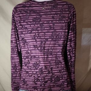 This Prana long sleeve t-shirt showcases a fitted design with a captivating pattern of alternating purple stripes. Crafted from a soft knit fabric, it offers both comfort and a sleek silhouette. The classic crew neckline adds a timeless touch to this versatile top, ideal for casual outings.