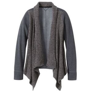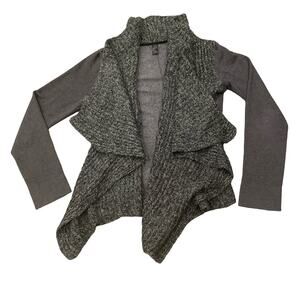 Stylish gray cardigan with open front. Cozy knit design. Perfect for layering.