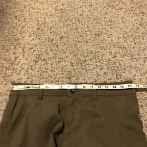 Prana Green Cargo Shorts. There is an inside drawstring around the waist. There are side pockets with zippers. There is a small stain on the front leg towards the middle. As shown in photos above. In otherwise great preowned condition. Feel free to make a reasonable offer through the offer button!