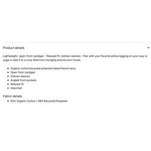 Prana Grey Open Front Cardigan. Size Large. Pockets.