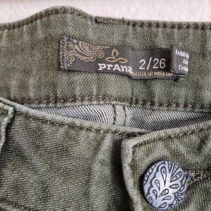 Prana cargo / army green color jean. Tapered to ankle. Size 2/ 26.