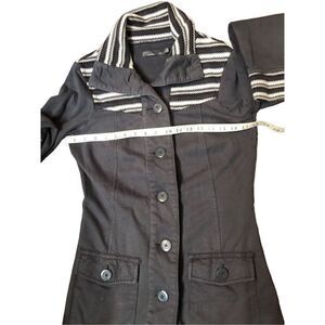 Prana Rowen Coat Knit Woven Button Up Pockets Long Jacket Gray XS. Two fully functional front pockets with buttons. Fleece style inner lining. Striped knitted shoulder front and back. Tactical Athleisure style.
