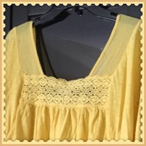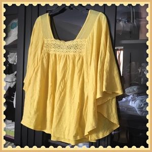 Lemon yellow flowy batwing top with feminine lace and mesh knit details on front and back at neckline. Loose fitting. Gently pre-loved. Made in India. 100% slug knit cotton.