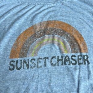 Light blue long sleeve tee with a colorful sunset graphic. So very oft and comfortable fabric. Perfect for casual wear or with a prairie skirt!