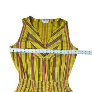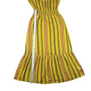 The dress has a striped pattern and is a dark yellow in color, making it perfect for a peasant, hippie, or bohemian look. The dress has pockets and a smocked waist feature, making it both stylish and practical. The dress is a size small and has a regular size type. The maxi dress has a long dress length and is perfect for a nature-inspired theme.