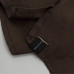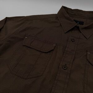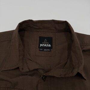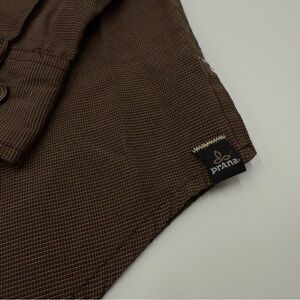 Prana button down shirt mens size Large. Brown and tan micro check with 2 velcro front pockets and one small velcro sleeve pocket. Roll up sleeves and underarm vents.