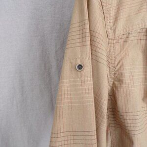 Lot of two Prana men's button down casual shirts for town or outdoor use with quick dry fabric, both size "SML" (see measurements). Excellent pre-owned condition, look like they've never been worn. One is tan with a subtle plaid, the other is a darker taupe with a dot pattern. Shirts are the same, as far as I can tell, except that the tan shirt has a 51/49 polyester/nylon blend and Velcro for the chest pocket flaps, while the taupe shirt has 54/46 poly/nylon blend and buttons for the pocket flaps. Smoke free home!