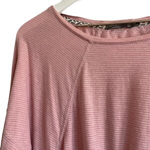 Super cute pink striped top from PrAna with a tie front and high-low cut. Size Medium. In good preowned condition; no visible flaws.