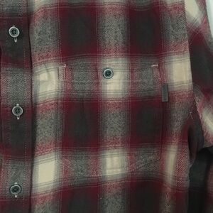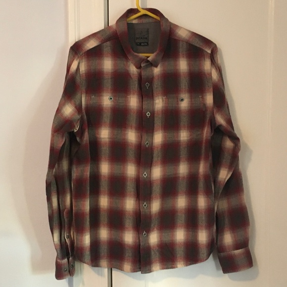 Very soft Prana plaid flannel long-sleeve in a muted red, grey and off-white pattern. Two chest pockets with buttons, grey corduroy at the back of the neck and inside the cuffs of the sleeves, and a pattern where the stripes actually match up. Overall, a really nice shirt in great condition!