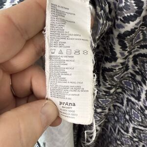Prana sleeveless racerback maxi dress with a geometric pattern in blue and black tones. Perfect for casual outings or beachwear. Made with recycled materials.