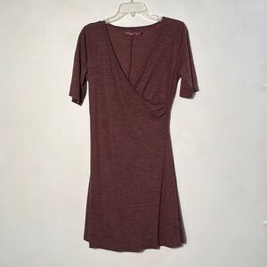 Stylish mini dress by Prana. Features a deep V-neck and half sleeves. Perfect for casual outings.