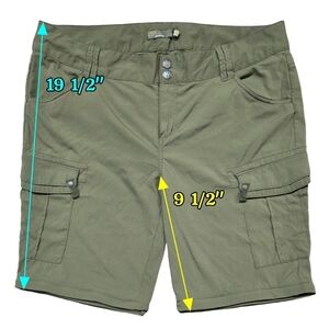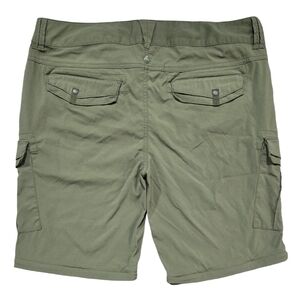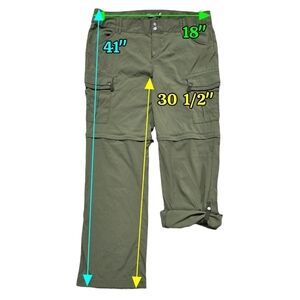 Good used condition, with no stains or tears. Olive green 3 in 1 convertible cargo pants. There are roll tabs to wear them cropped, and they zip off to become shorts. Has 6 pockets and a zip fly/inner draw string.