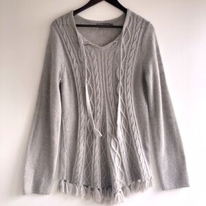 Poncho silhouette with sleeves and diamond cable pattern, split neckline with front ties, relaxed fit, fringe detail along the hem, longer than hip length, long sleeves, logo hardware on back