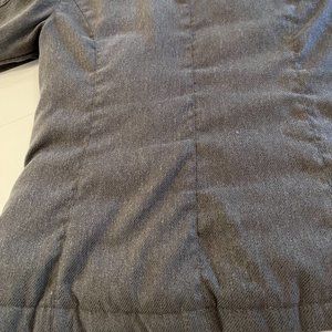 Down filled cozy jacket with stretchy funnel collar and slim fit. This jacket is in good condition, with some fading to the original charcoal gray. Features: