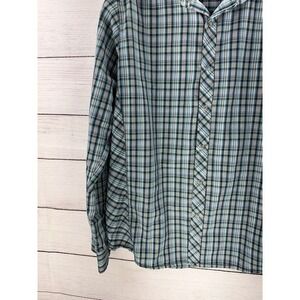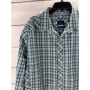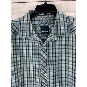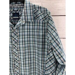Prana Slim Fit Button Up Western Shirt Large Plaid Blue Long Sleeve Pearl Snap