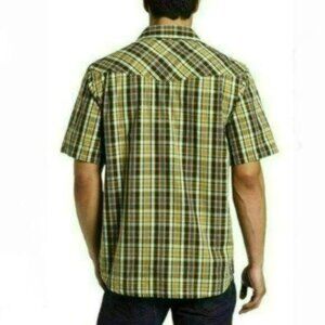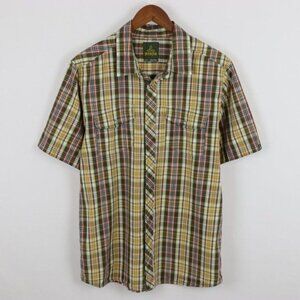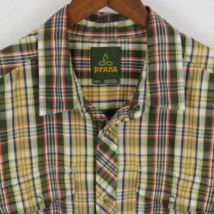 Prana Whiskey Men's Medium Green Black Plaid Cotton Short Sleeve Snap Up Shirt