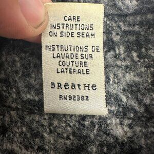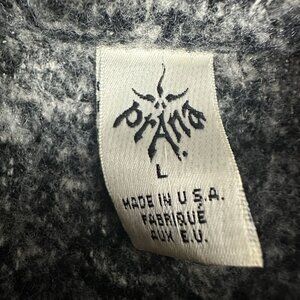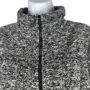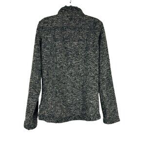 This Prana women's gray and black sweater jacket features a stylish full-zip design with a high collar for added warmth. Crafted in the USA, it showcases soft and cozy fabric with excellent texture, ensuring comfort and durability. Size large, this jacket is perfect for layering in cooler weather.