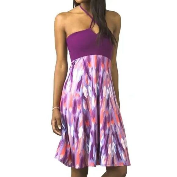 Prana Women's XS Solana Grapevine Gemstone Halter A-Line Dress Purple EUC