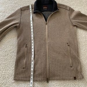Warm and cozy Prana sweater. Has 2-way zip front, top zip down, and zip bottom up. 2 front zip pockets, size medium. Wool blend will keep you comfy, and warm. Machine wash. Sweater is in good condition, minor piling.
