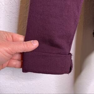 Prana Demure maroon and purple knit open front waterfall cardigan. Fold over collar with waterfall open front. Maroon sweater knit front. Purple sweatshirt material back and sleeves. Folded sleeve cuffs. Size XS. Excellent preowned conditon. Minor fuzzing and wash wear as shown. Cotton polyester back with acrylic wool blend knit. Machine wash.