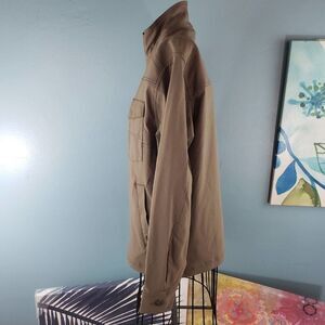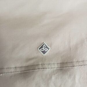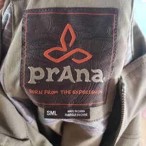 This is a preowned greenish brown nylon blend jacket from PrAna. In great condition with no flaws. It is a size small and it has pockets in the front. Perfect for outdoor activities and weather. Working zipper up the front.
