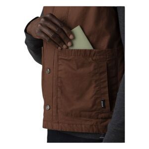 Prana x PrimaLoft Collaboration Trembly Insulated Vest in Stout Brown Cotton Canvas. Whether you're crushing the work day or on an epic vacation, this vest is a trustworthy companion. It's a heavier weight style with the perfect amount of warmth to keep you moving, and interior quilting that creates a core of comfort. Inside you'll find a passport compatible zip pocket, keeping it safe and secure, plus handy pockets on the outside too.
