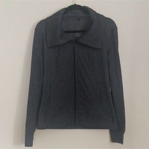 Prana Heathered Charcoal Grey Zip Up Athletic Jacket. 2 front slip pockets, stretchy polyester/Spandex blend, large collar.