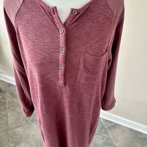 Step out into your next adventure in this mauve colored Prana dress in a relaxed fit style. Featuring 5 button placket, long sleeves with roll-up tab in an organic cotton, polyester and spandex blend. Length 34” x Width 19” pit to pit.
