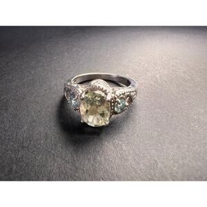 Genuine gemstones of prasiolite and blue apatite prong set in a platinum bond setting of platinum plated over copper with magnet. Measures a size 8