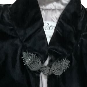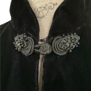 Longer length, stand up collar, shoulder pads, and long sleeves. Open front, jet bead and sequin ball and loop closure at the neck, and a glistening taffeta lining.