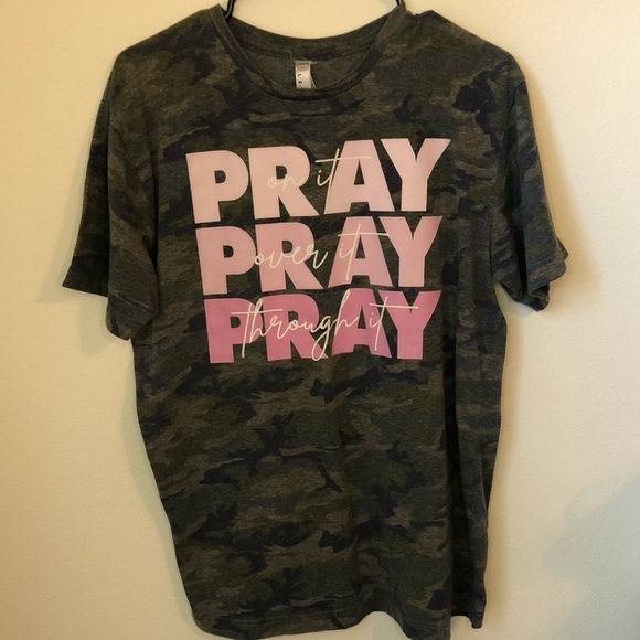 Shirt is in great condition! Army pattern with pink lettering. Tag has been slightly torn. Shirt says “Pray on it, Pray over it, Pray through it”