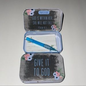 Tin prayer boxes come with a notepad and a pencil for writing messages or prayers.