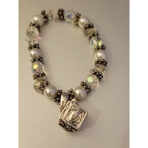Prayer Box stretch Adjustable Charm Bracelet , Black crystal , Iridescent crystal and pearls, sm/med fit.