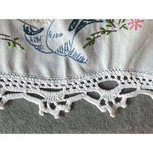 This delicately hand-embroidered pillowcase showcases intricate praying hands and floral details. Accented with a crocheted lace border, it adds a touch of elegance to any bedding ensemble.
