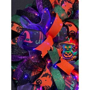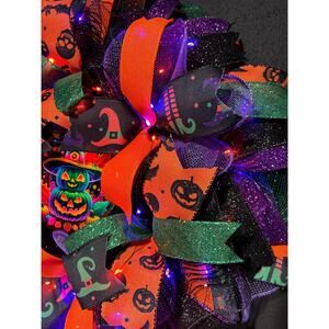 Pre Lit Halloween Wreath Glowing Pumpkin Light Up 24 Inch Handmade Deco Mesh