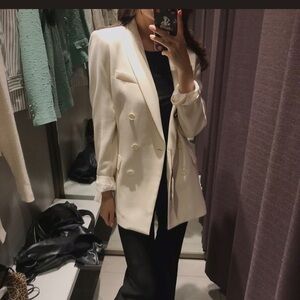 This Zara cream blazer features a relaxed, modern fit with wide lapels and a double-breasted front. Its minimalist design and substantial fabric offer a contemporary silhouette that extends past the hips, making it a versatile addition to any wardrobe.